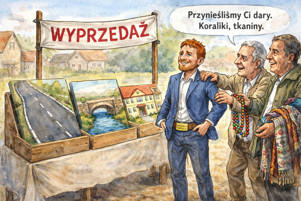 Albo historycznie: przyjeżdżają „dobrzy ludzie z zewnątrz”, obiecują pomoc, a my w zamian oddajemy im gotową infrastrukturę. Trochę jak wymiana paciorków na złoto z Indianami, tylko w nowoczesnej, samorządowej wersji. Z protokołem zdawczo-odbiorczym.