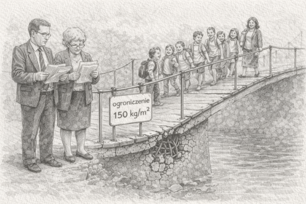 Z informacji wynika, że dopuszczalne obciążenie mostu wynosi 150 kg/m². Próba zweryfikowania tej wartości napotyka jednak trudności, ponieważ protokół z przeglądu nie został udostępniony opinii publicznej. Należy zauważyć, że nawet dwie dorosłe osoby poruszające się obok siebie na spacerze mogą generować nacisk przekraczający wskazany limit. Czy w tej sytuacji działania urzędników Urzędu Gminy Płaska można uznać za racjonalne i podyktowane troską o bezpieczeństwo mieszkańców, czy też stanowią one nieuzasadnione ryzyko i narażanie ludzi na potencjalne zagrożenie? Czy most nie powinien być w trybie natychmiastowym doraźnie naprawiony albo wyłączony z użytku, aby uniknąć nieszczęścia?