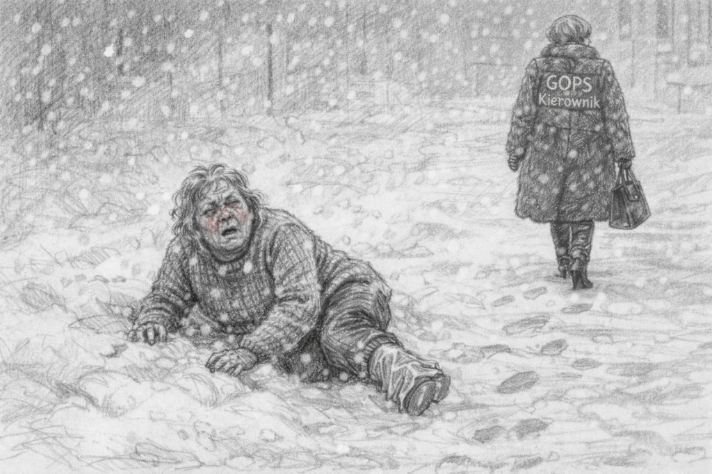 Kilka dni wcześniej ta sama instytucja była w domu tej kobiety — domu, w którym temperatura była taka jak na zewnątrz. Zareagowano tylko dlatego, że ktoś się zatrzymał, a Wójt wezwał pomoc. Kobieta najwyraźniej chora — skoro po odprowadzeniu do domu wychodziła w śnieżycę, a później nie wiedziała, gdzie mieszka.